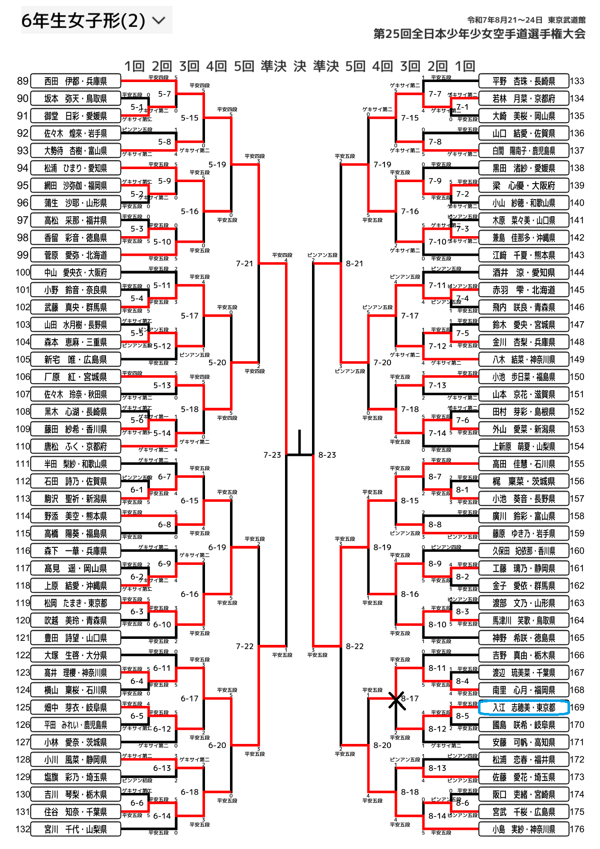 2025年8月21日~24日、東京武道館に於いて第25回全日本少年少女空手道選手権大会に開催されました。当会からは、6年生女子形競技に強化指定選手の入江志穂美選手が東京都代表として出場しました。